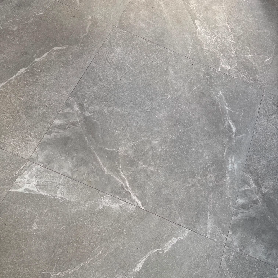Presenting our new extra-large, anti-slip Madrid Grey stone-effect porcelain tiles, sized at 1000x1000 mm. These versatile tiles are ideal for both walls and floors, and can also be used outdoors when installed on a solid concrete base. Perfect for creating a modern aesthetic in kitchens and open-plan living areas, they enable seamless indoor and outdoor matching. Using the same tile in different spaces, particularly in this large format, creates a stunning illusion of expanded space and continuity.